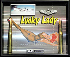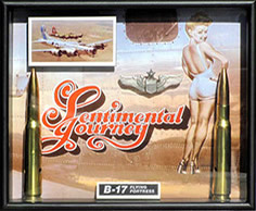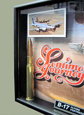 8" x 10" x 1.75" deep. Authentic .50 cal. bullets, raised pilot wings & aircraft image, metal identification name plate. Can be hung or displayed on shelf. $95.00 ea. |