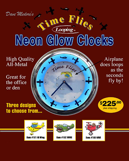 Blue neon behind a bright chrome bezel with a glass cover and a frosted outer ring. Sky background, clocks are 12" in diameter and run on one "AA" battery (included). Neon powered by 110 house current. 90 warranty.